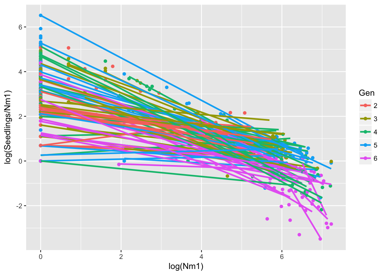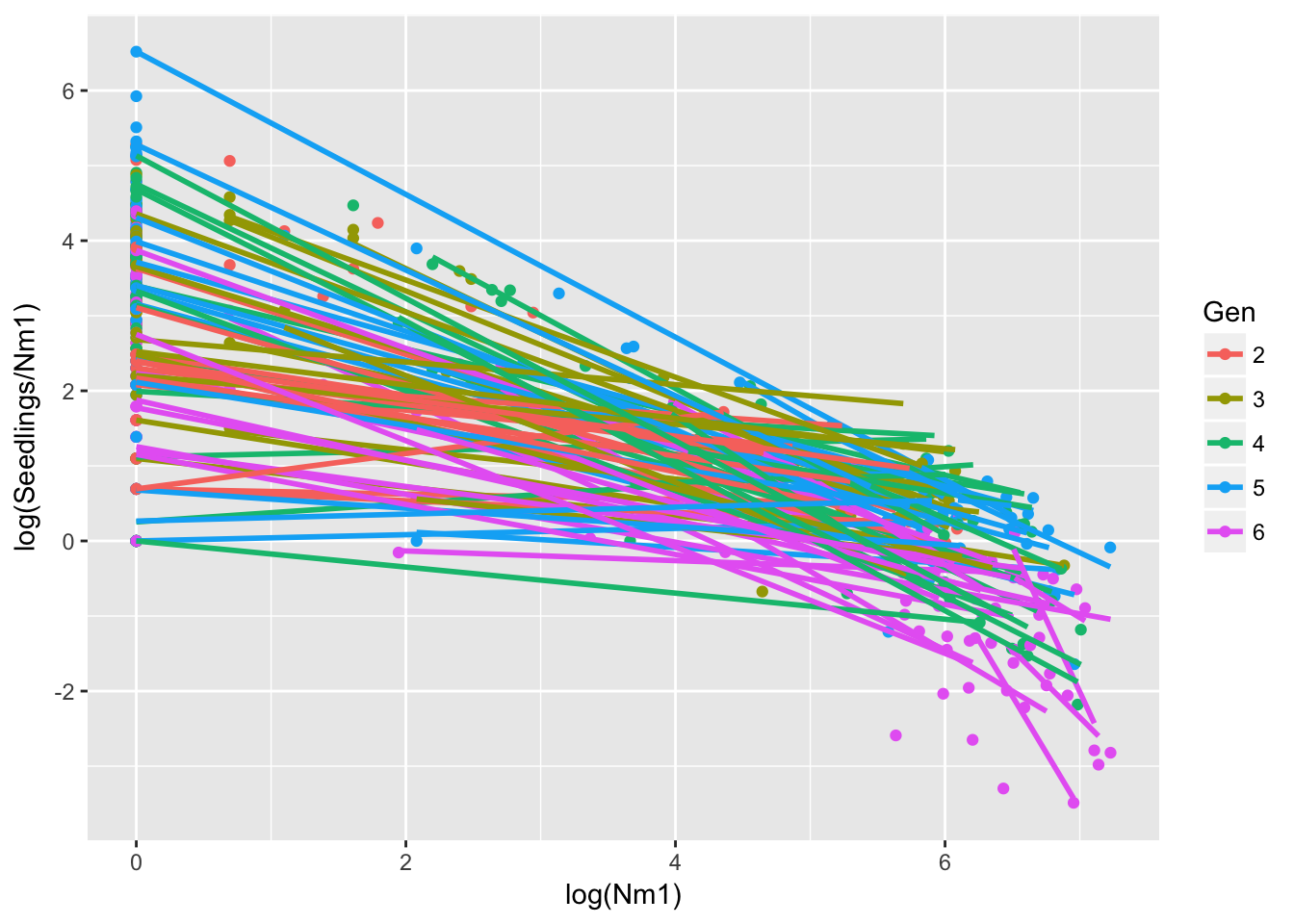 DD.lm <- lm(log(Seedlings/Nm1) ~ log(Nm1) + Gen * ID, data = seed_data)